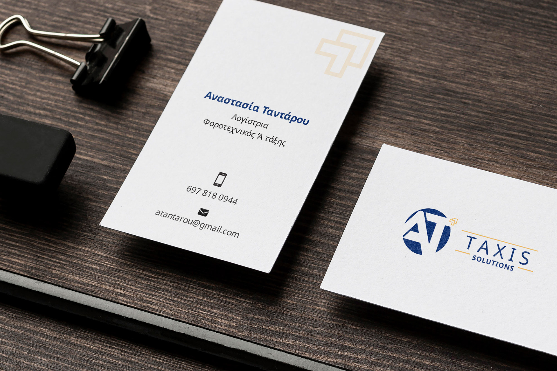 Το λογότυπο σχηματίζει μία σφραγίδα που πιστοποιεί την ποιότητα των υπηρεσιών και τις σχέσεις εμπιστοσύνης που αναπτύσσει η λογιστική εταιρεία "AT Taxis Solutions" με τους πελάτες της. Ο συνδυασμός του μπλε και του χρυσού συμβολίζει τη μακρόχρονη εμπειρία της εταιρείας και την ολοκληρωμένη υποστήριξη που προσφέρει σε ιδιώτες και επιχειρήσεις. Τα δύο βέλη εκφράζουν την αξία και τη συνεχή πρόοδο – αντικατοπτρίζοντας τη δέσμευση της εταιρείας να εξελίσσεται και να βελτιώνεται μέσω της χρήσης νέων τεχνολογιών, προσφέροντας τις καλύτερες δυνατές υπηρεσίες.