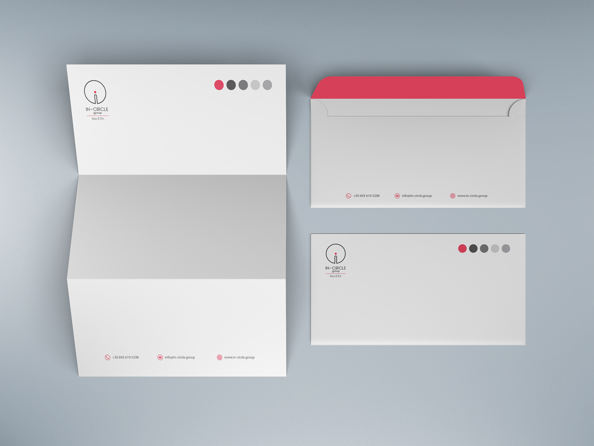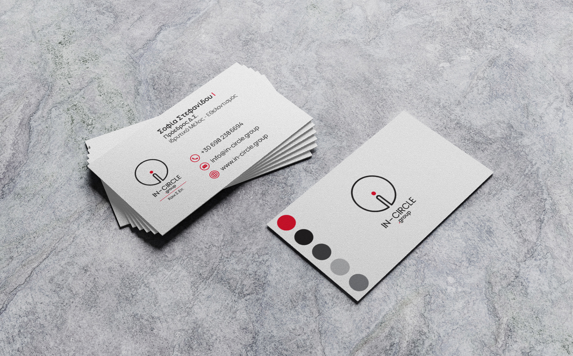 Η In-Circle.Group υποστηρίζει τη γυναικεία επιχειρηματικότητα στην Ελλάδα, ενώ παράλληλα ενισχύει οικονομικά και με άλλους τρόπους τις εθελοντικές δράσεις της ομάδας "Άγγελοι Αγάπης". Στο σχεδιασμό του λογοτύπου, ο κύκλος συμβολίζει την ομάδα, την ενότητα και την κοινότητα. Στο κέντρο, το κάθετο στοιχείο "i", προερχόμενο από τη λέξη "in", αντιπροσωπεύει το άτομο και υπογραμμίζει τον ανθρωποκεντρικό χαρακτήρα της ομάδας, με επίκεντρο την ανάπτυξη και τη βελτίωση προς όφελος του συνόλου. Το μαύρο χρώμα του κύκλου δηλώνει τη δύναμη και τη σταθερότητα της ομάδας, ενώ το κόκκινο εκφράζει τη δράση, τη θετική ενέργεια και την αποφασιστικότητα κάθε ατόμου να συμβάλει στην κοινωνία. Στην ανάπτυξη της εταιρικής ταυτότητας χρησιμοποιούνται πέντε κύκλοι, που συμβολίζουν τα πέντε ιδρυτικά μέλη της εταιρείας. κή ενέργεια. Οι πέντε κύκλοι της εταιρικής ταυτότητας εκπροσωπούν τα πέντε ιδρυτικά μέλη. Το website διατηρεί απλό, καθαρό και κυκλικό σχεδιασμό, εναρμονισμένο με τη φιλοσοφία του brand.